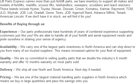 We offer you the best deals on all parts for your fleet of lift trucks. Phone today to get an estimate on one of the parts or attachments we offer. We can be reached at: